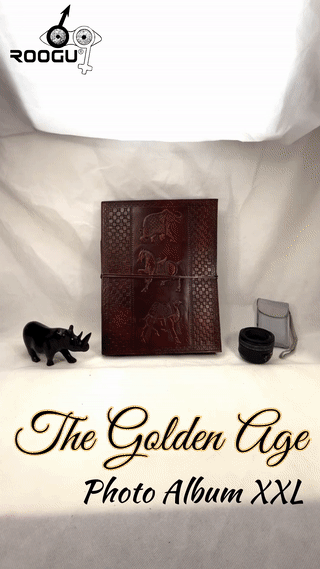 Unser handgefertigtes XXL Fotoalbum mit Büffelledereinband aus Indien ist das perfekte Zuhause für Ihre wertvollsten Erinnerungen. Mit seiner prächtigen Prägung von Elefant, Kamel und Pferd, die von kunstvollen Ornamenten umgeben sind, erinnert es an die goldenen Zeiten der Antike und repräsentiert somit auch die goldenen Zeiten in jedem Menschenleben.