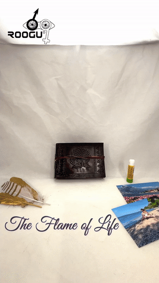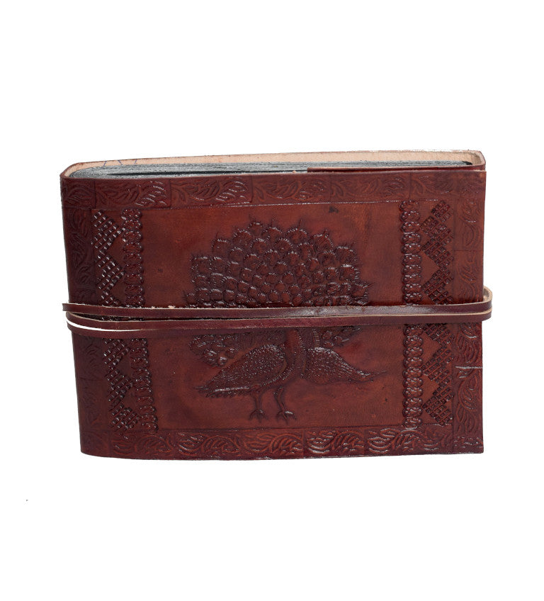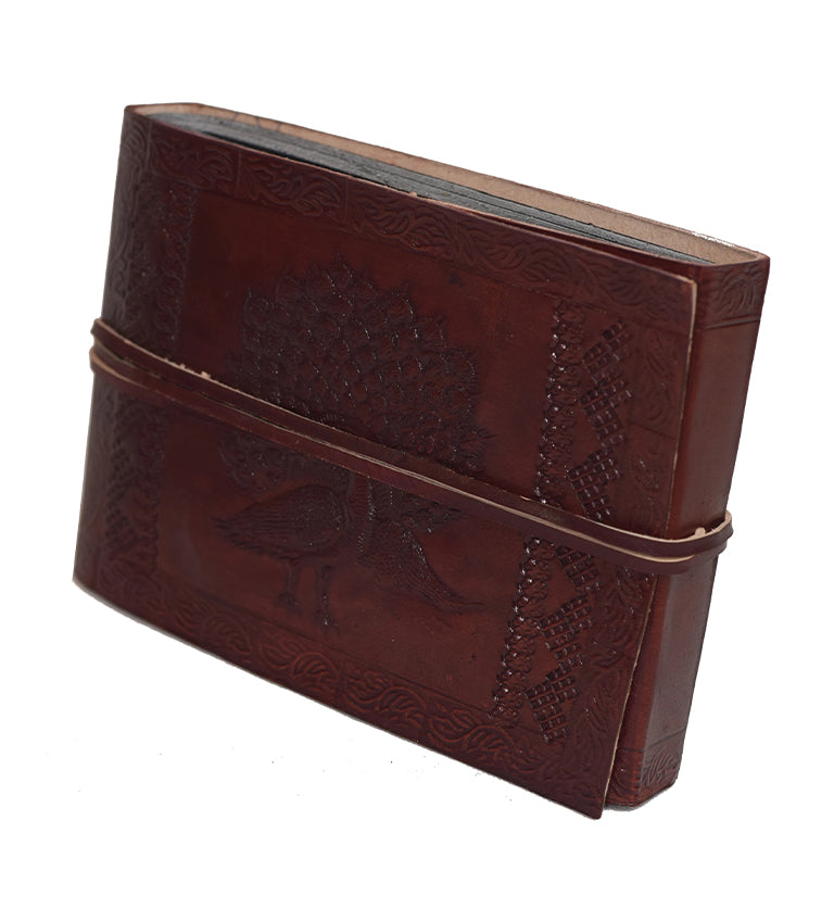 Die Flamme des Lebens - kleines Fotoalbum Büffelleder Baumwollpapier Indien Pfau