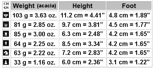 Bitte beachten Sie, dass das Set kein Schachbrett enthält. Die Größen der Figuren können Sie der letzten Grafik in der Bildergalerie entnehmen.