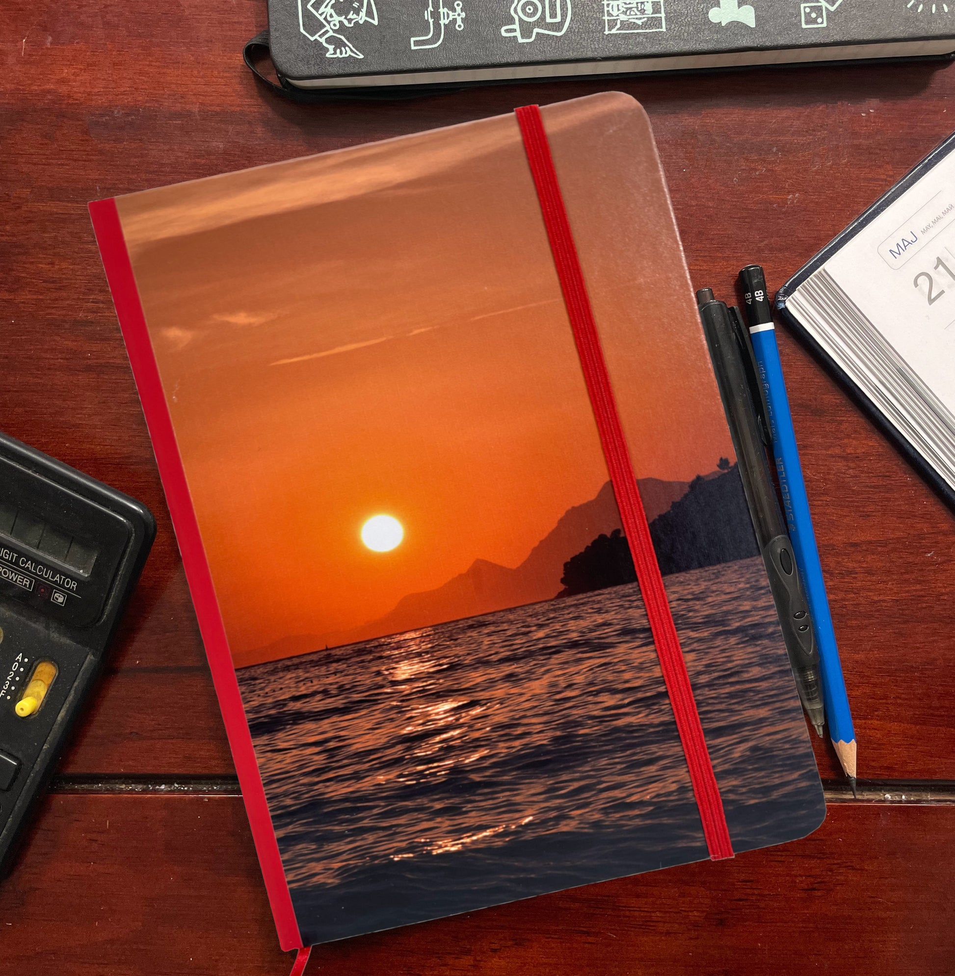 Das ROOGU Notizbuch kombiniert künstlerische Fotografie mit praktischer Funktion. Der Einband zeigt eine atmosphärische Aufnahme des Adriatischen Meers mit dem Biokovo-Gebirge im Hintergrund – eingefangen von ROOGU (Instagram: @roogu.photos).