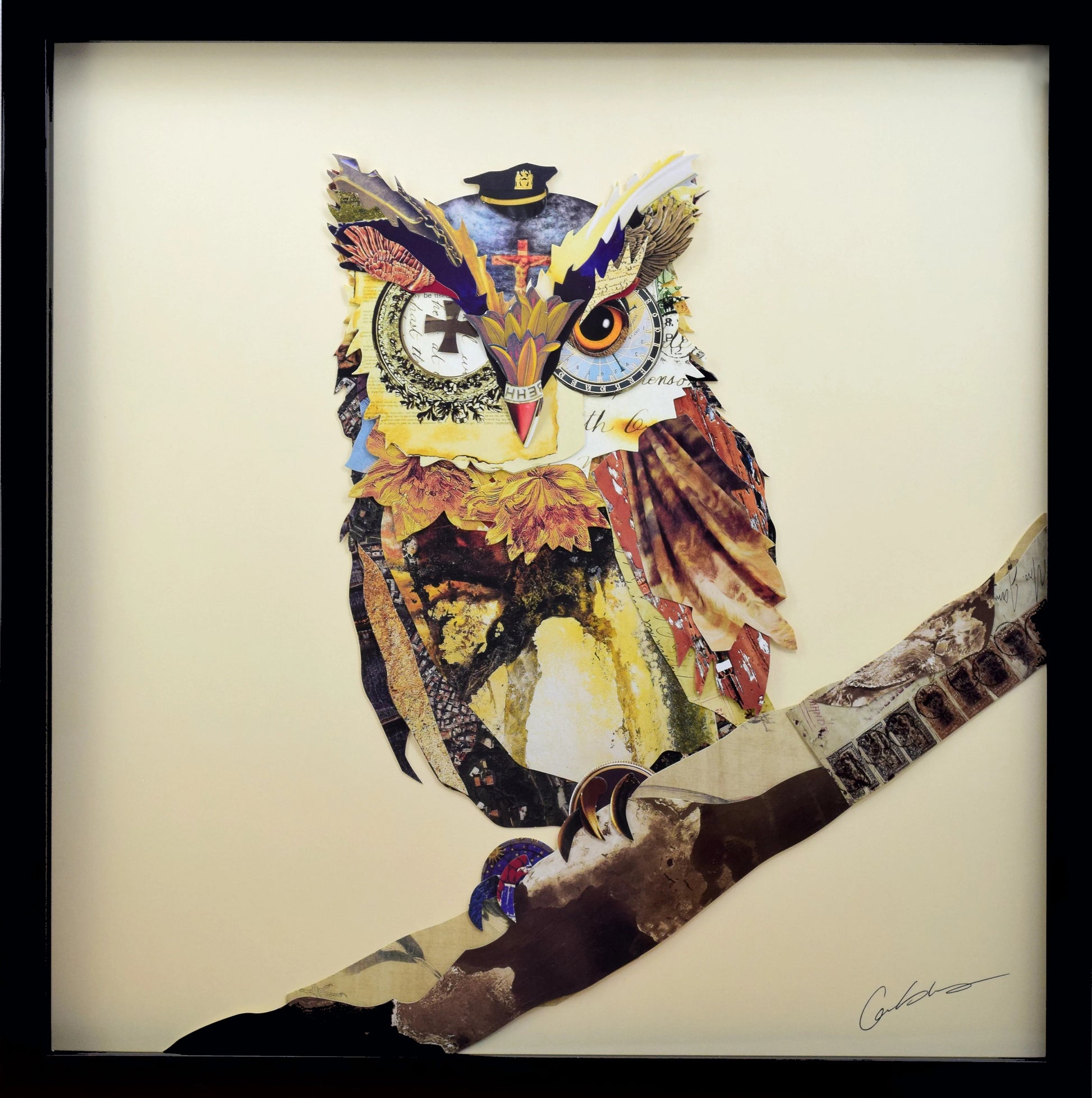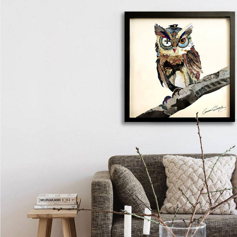Handarbeit 3D * Collage Kunst Frame Art Wand Bild Uhu Lein Eule Militär Uniform